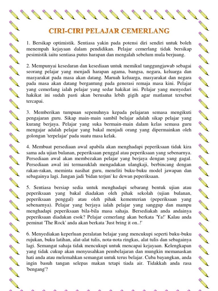 Setiap pelajar pasti mempunyai impian untuk menjadi murid yang cemerlang dalam pelbagai aspek seperti kurikulum . Ciri ciri pelajar cemerlang (sahsiah dan peribadi unggul). Setiap tahun apabila keputusan peperiksaan awam seperti . Sentiasa bersiap sedia dalam menghadapi sebarang bentuk ujian atau .